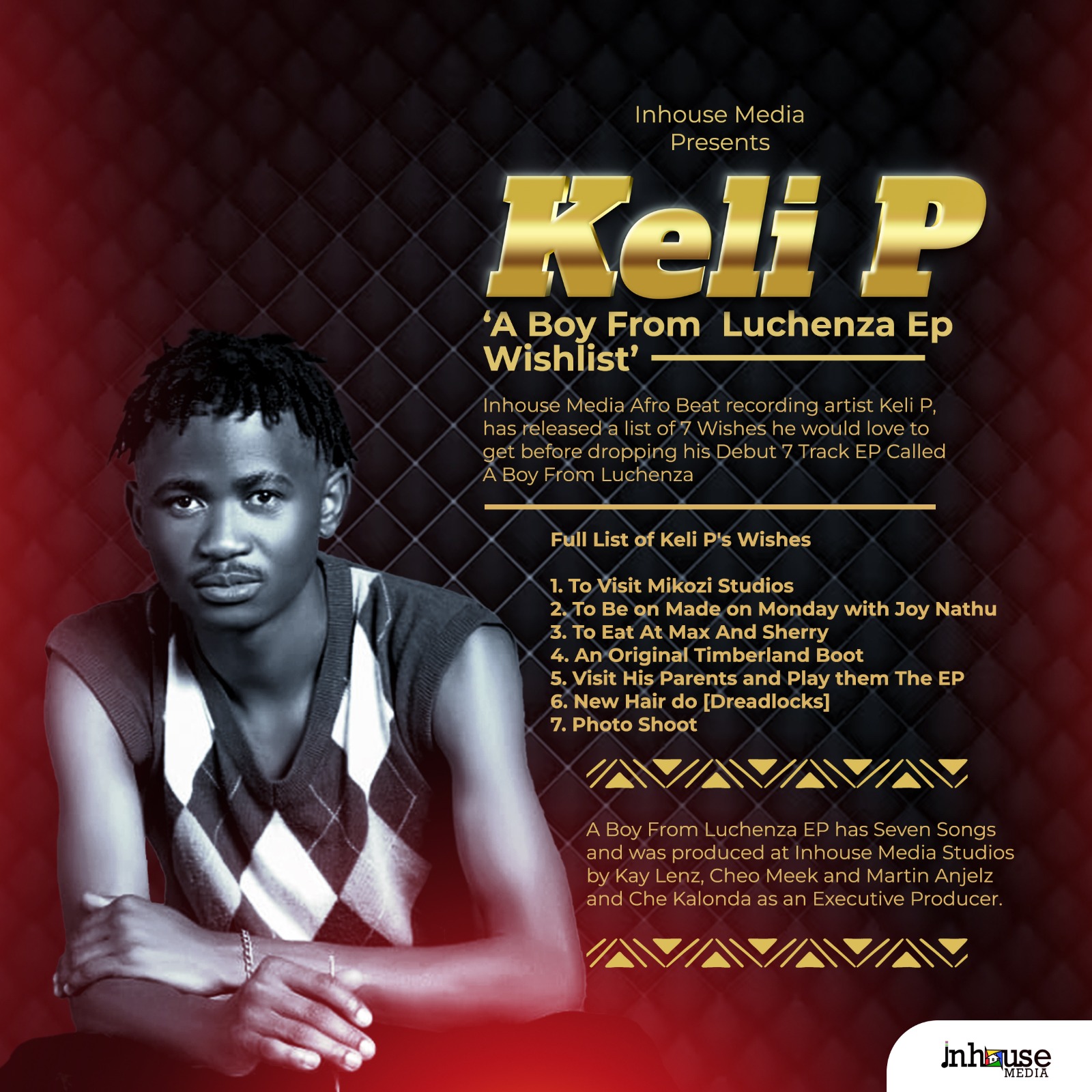 Inhouse Media has revealed that Keli P is eager to share his music with loved ones, with a wish list that includes performing all the EP’s songs for his parents and family.